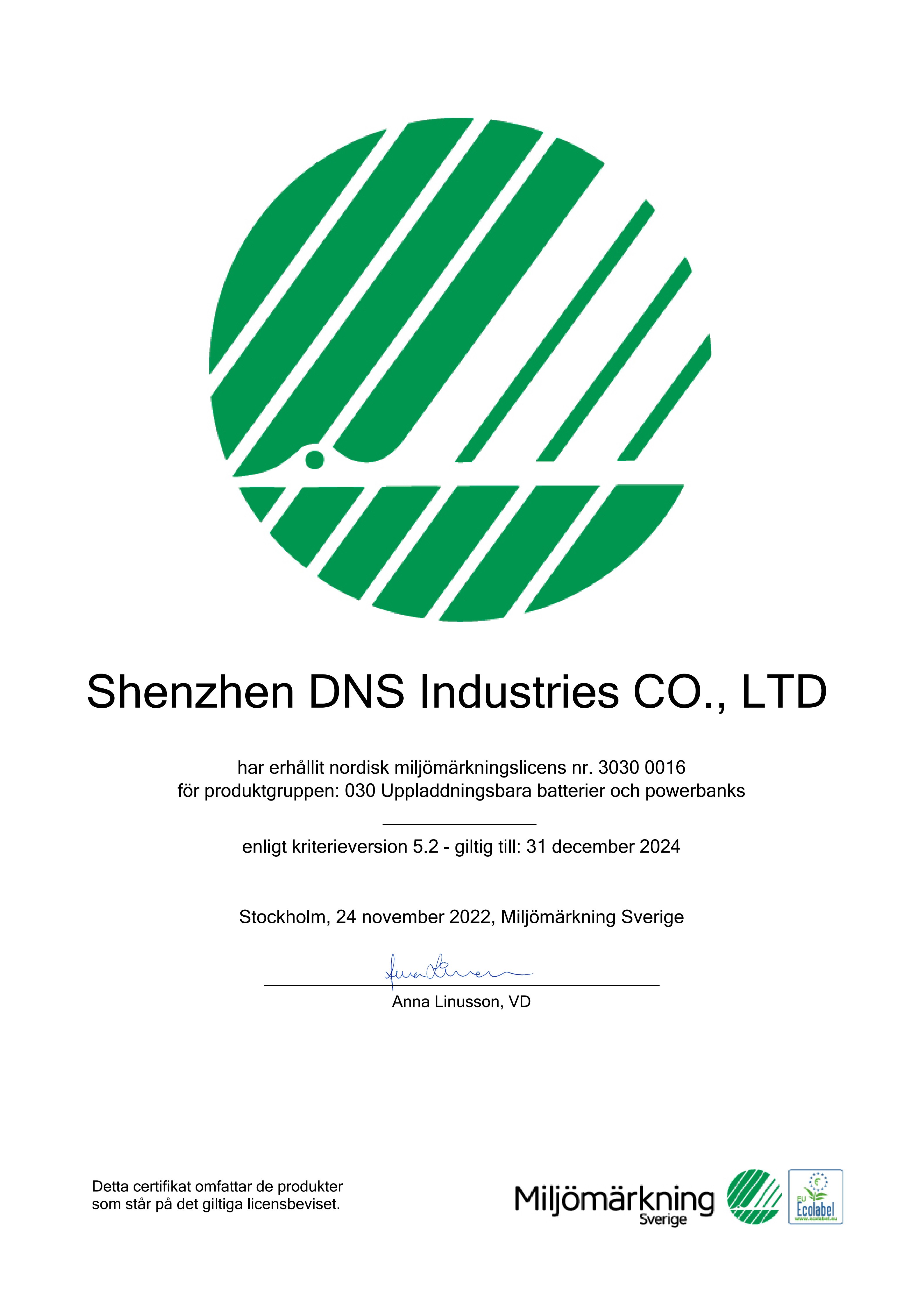 11月25日,深圳市和宏實業股份有限公司獲得北歐白天鵝生態標簽(Nordic Swan Ecolabel)認證, 成為全球首個獲得充電寶北歐白天鵝生態標簽認證的公司。慶祝和宏加入白天鵝家族,共同為綠色轉型而努力。